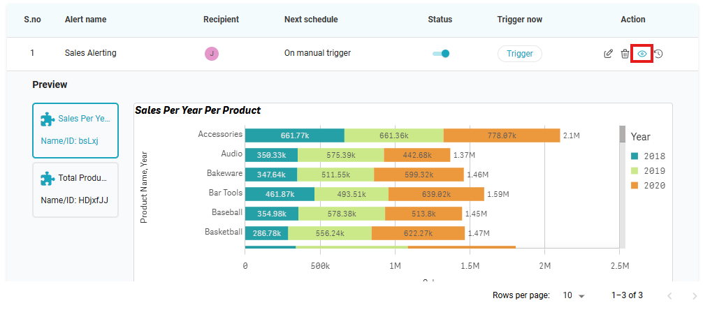 Click "Eye" option to preview the charts added to the alert before triggering it.