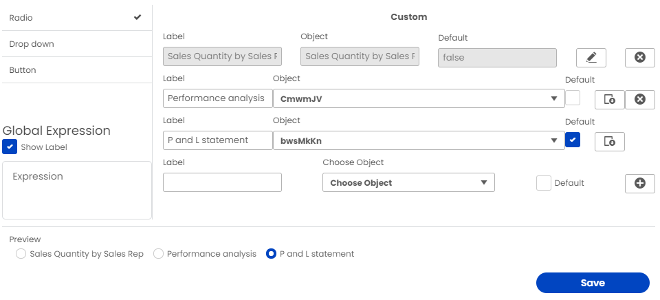Users can decide which toggle object suits best for his/her chart from radio buttons, dropdowns, and buttons. Whatever the user chooses, it'll be reflected in the preview section. User can also display dynamic label using Global expression.